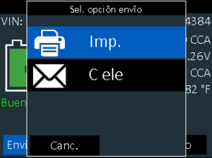 8.)Res.– Verá el resultado general que aparece en la primera página. Si se desplaza a la derecha del teclado numérico al presionar el botón derecho llegará a la decisión de arranque seguido del resultado del estado de reserva. En la última pantalla se visualizará el código de la batería. Desde la primera pantalla puede elegir imprimir en la impresora de a bordo o enviar un correo electrónico del resultado, ejecutar una prueba de sistema o al seleccionar listo, le regresará a la pantalla de inicio.