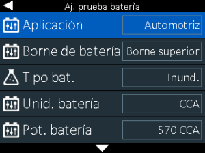 Utilice la prueba en el vehículo para examinar las baterías bajo los parámetros de prueba determinados por el VIN del vehículo o introduzca manualmente los parámetros de la batería. También está disponible una prueba del sistema para el arrancador y la carga.