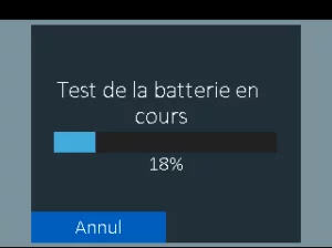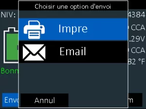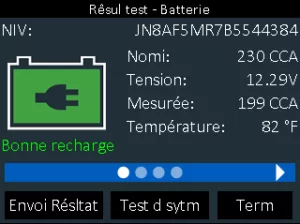 8.)Résultats– Vous verrez le résultat global affiché sur la première page. Un défilement vers la droite sur le clavier en appuyant sur le bouton droit permet d’accéder à la décision de démarrage, suivie du résultat sur l’état de la réserve. Le dernier écran fournit le code de la batterie. À partir du premier écran, vous pouvez choisir d’imprimer le résultat sur l’imprimante embarquée ou de l’envoyer par e-mail, de procéder à un test du système ou de sélectionner Terminé pour revenir à l’écran d’accueil.