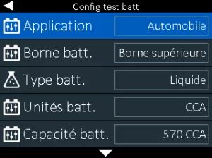 Utilisez la fonction Test à bord du véhicule pour effectuer des tests sur des batteries installées sur des véhicules à l’aide des paramètres de test déterminés par le NIV, l’année, la marque et le modèle du véhicule à tester. Un mode de test pour la charge et le démarrage est également disponible.