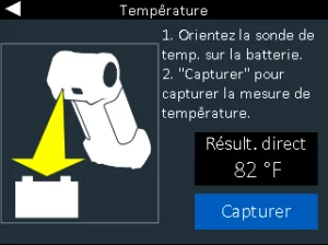6.)TempératureTenez le capteur à une distance de 15 à 30 cm (6 à 12 po) au-dessus de la batterie et sélectionnez Capturer pour enregistrer la température de la batterie